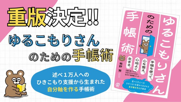 延べ1万人の支援経験から生まれた新しいセルフケア手帳術が重版決定!出版記念講演会を全国5拠点で無料開催 ―『ゆるこもりさんのための手帳術』著者・熊野賢 2025年10月14日 社会問題化する“見えない生きづらさ”に新しいアプロ